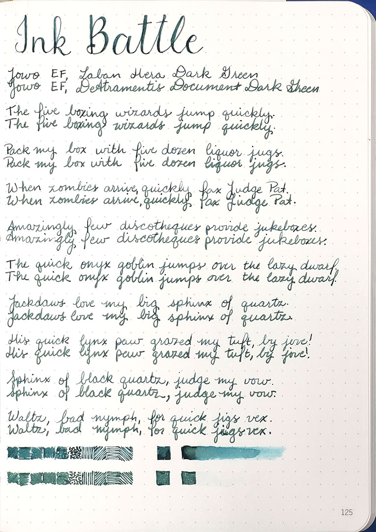 This ink battle is between Laban Hera Dark Green and DeAtramentis Document Dark Green. Both inks are in pens with the unaltered Jowo EF nibs. The paper is a Rhodia Goalbook with white paper.